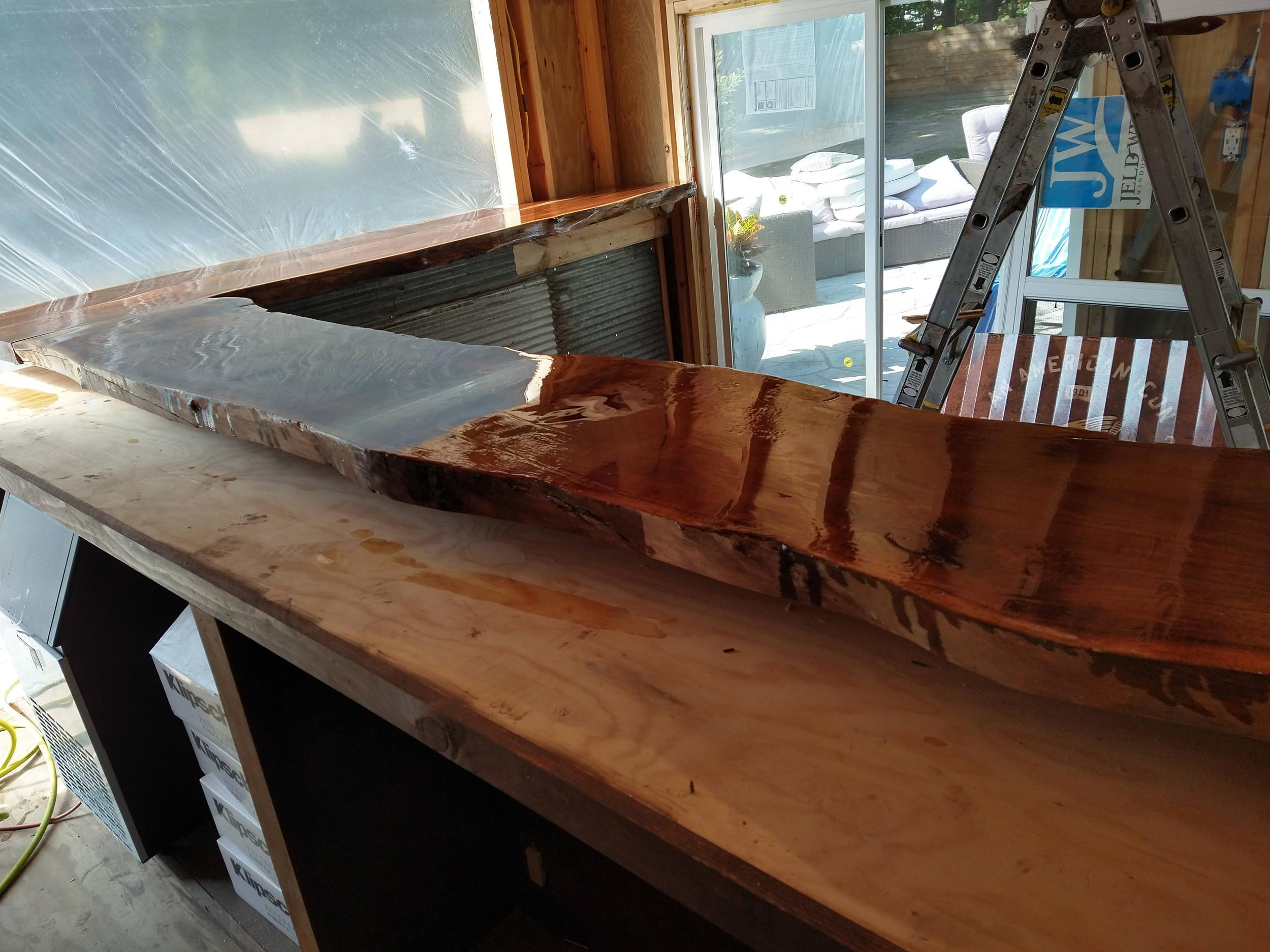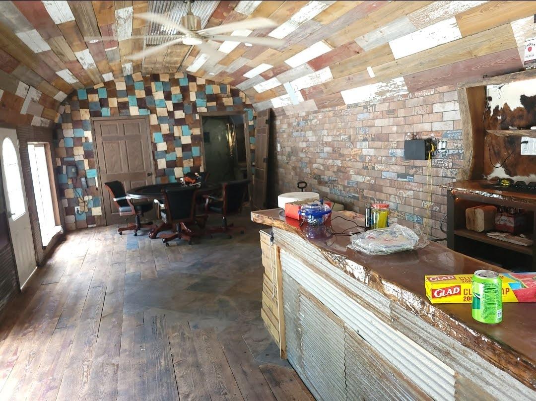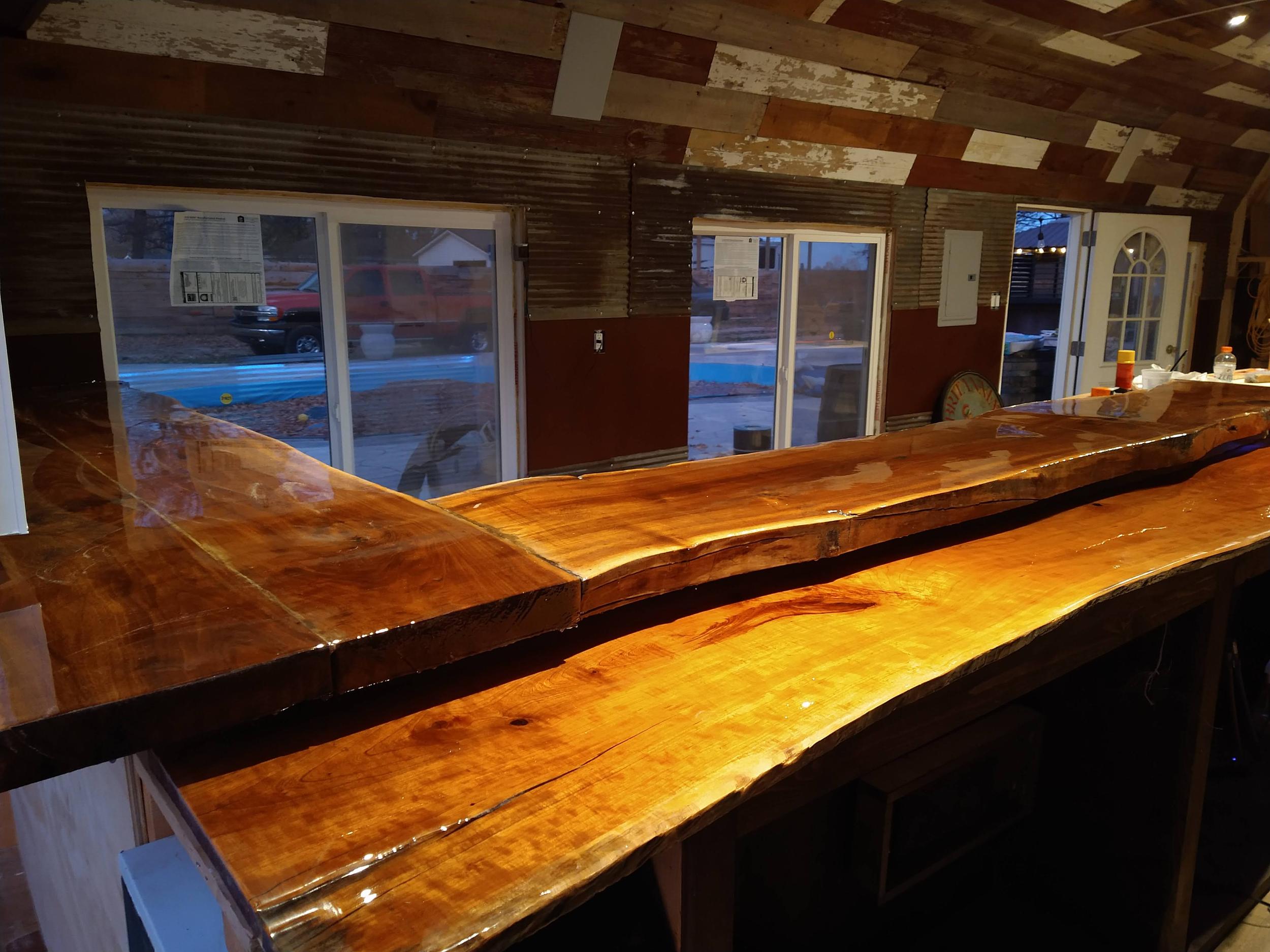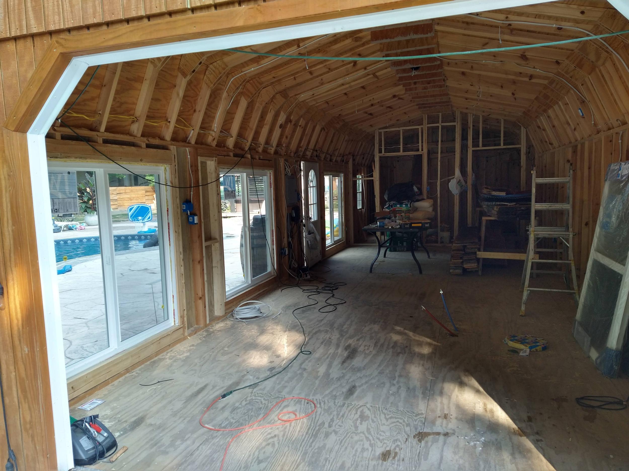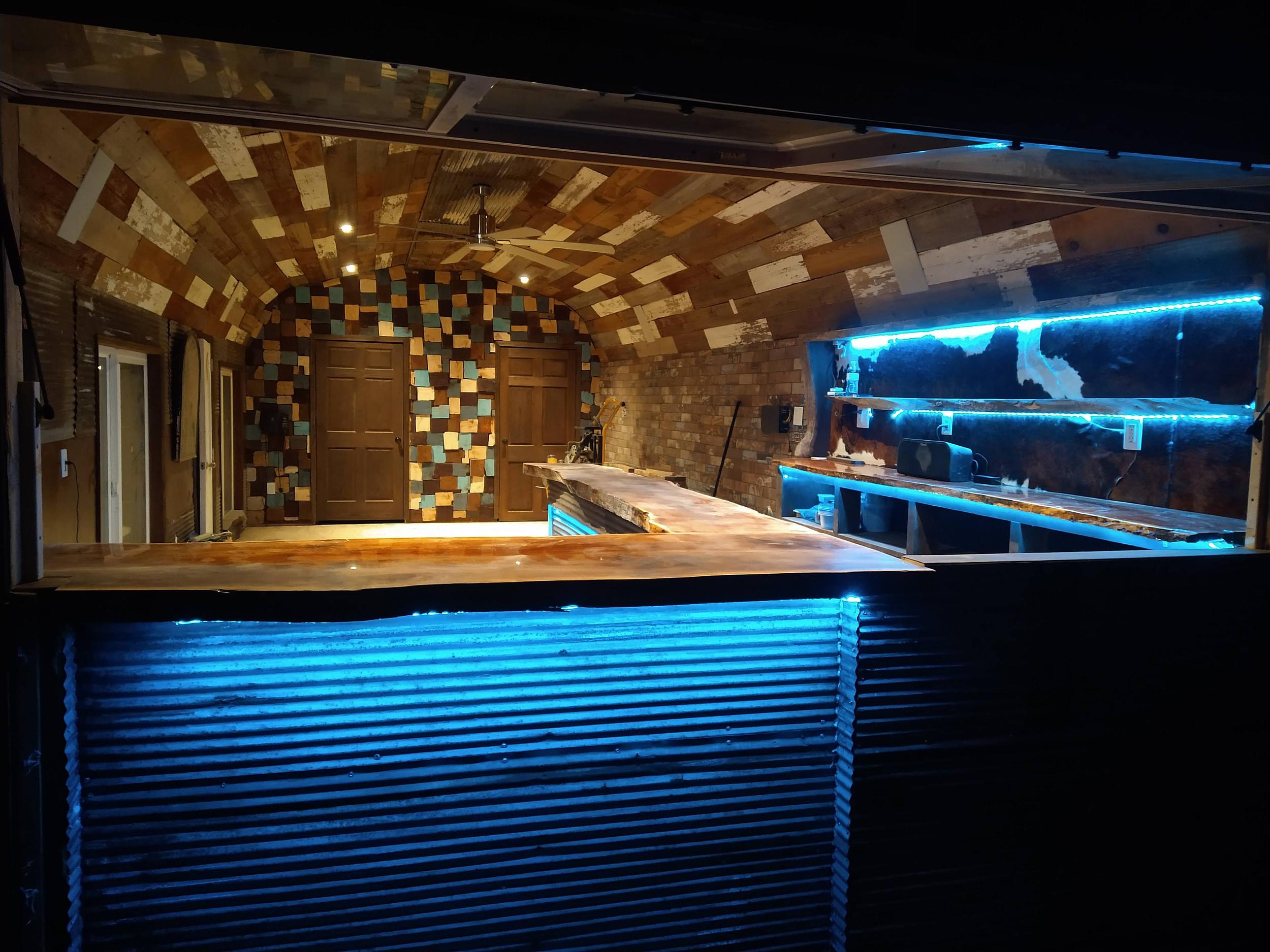 This backyard pool house project was designed to create a functional and inviting entertainment space. The build included a custom bar area with handcrafted live-edge epoxy bar tops, reclaimed wood ceiling accents, custom shelving, and integrated LED lighting. The space was finished to bring together rustic materials with modern lighting to create a unique outdoor gathering area.