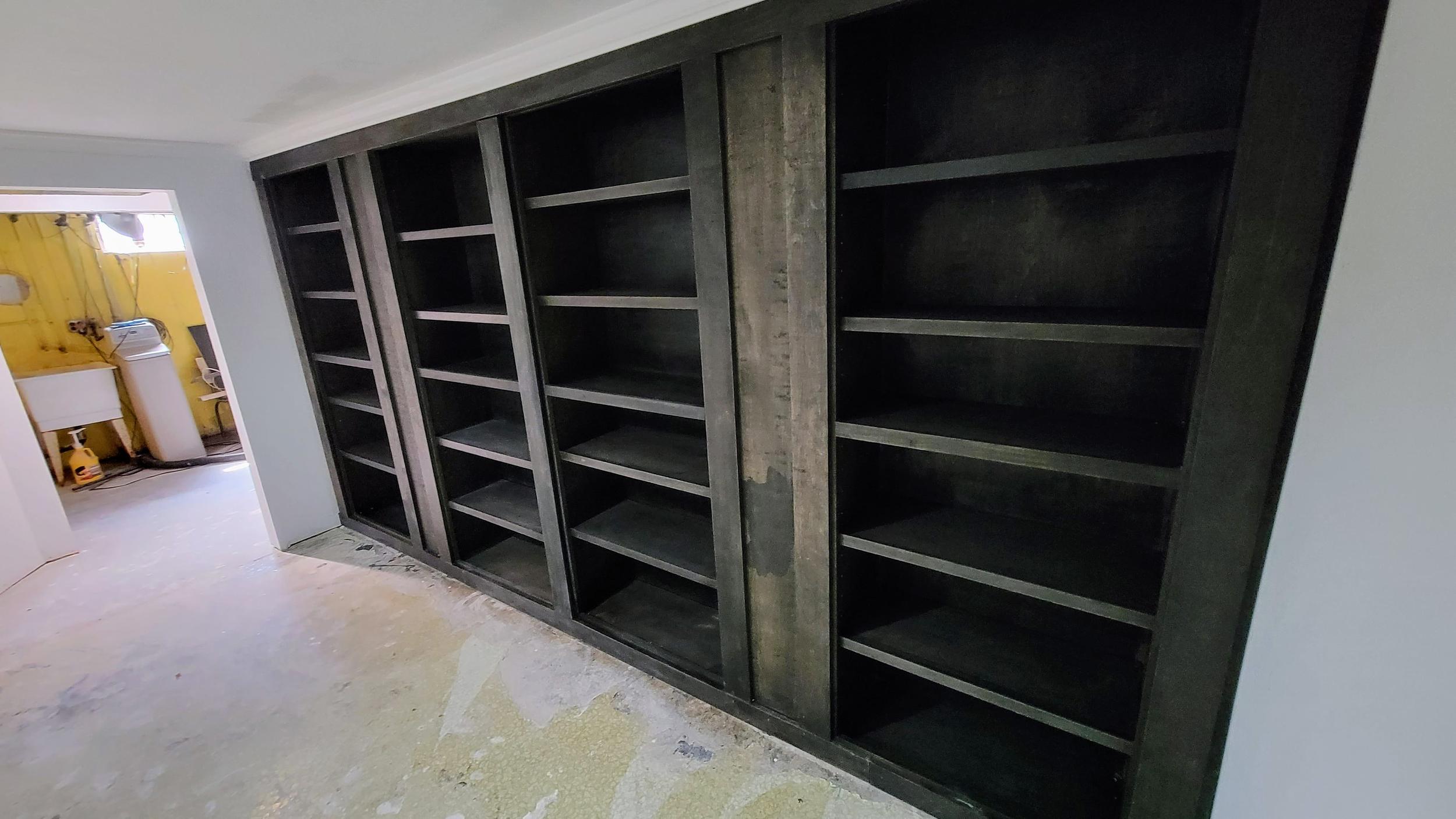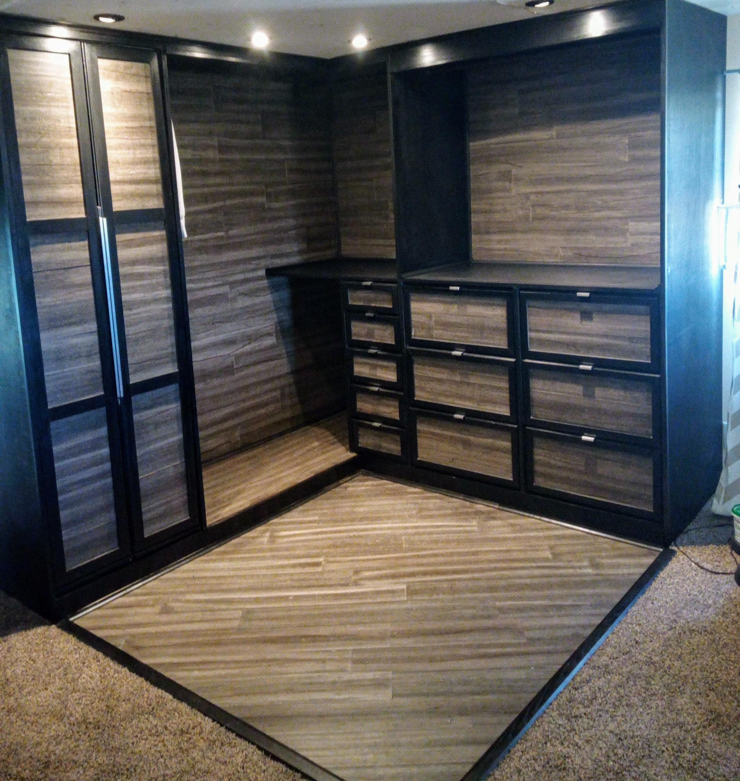 All-new custom-built closet featuring poplar drawers, 2'6" pullouts with full-height shelving for shoes and storage, bamboo flooring, bamboo wall panels, and bamboo drawer faces. Finished with new lighting throughout for a clean, modern look.